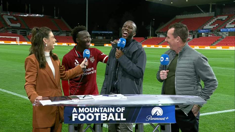 Quizzed by former Adelaide striker and current Network 10 analyst Bruce Djite, who asked: “Are you going to be speaking German soon?”, the Reds forward provided a hilarious response.