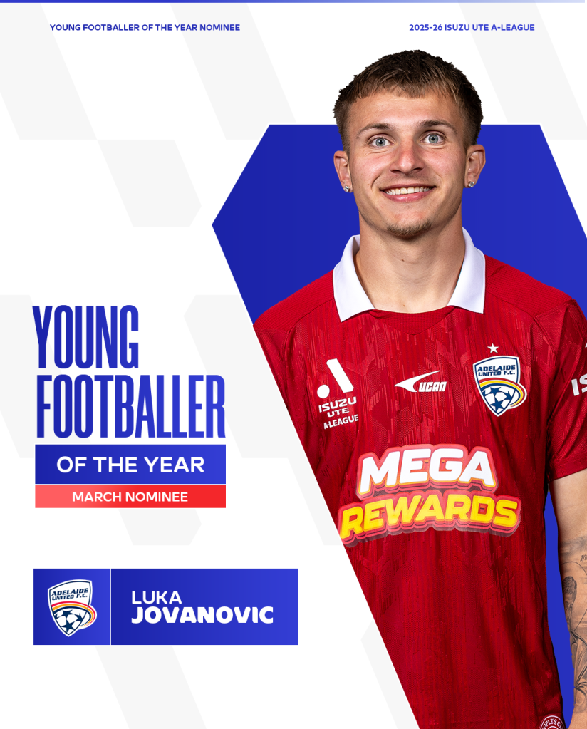 Adelaide United striker Luka Jovanovic has been rewarded for his excellent recent form, earning the March nomination for Young Footballer of the Year in the Isuzu UTE A-League.