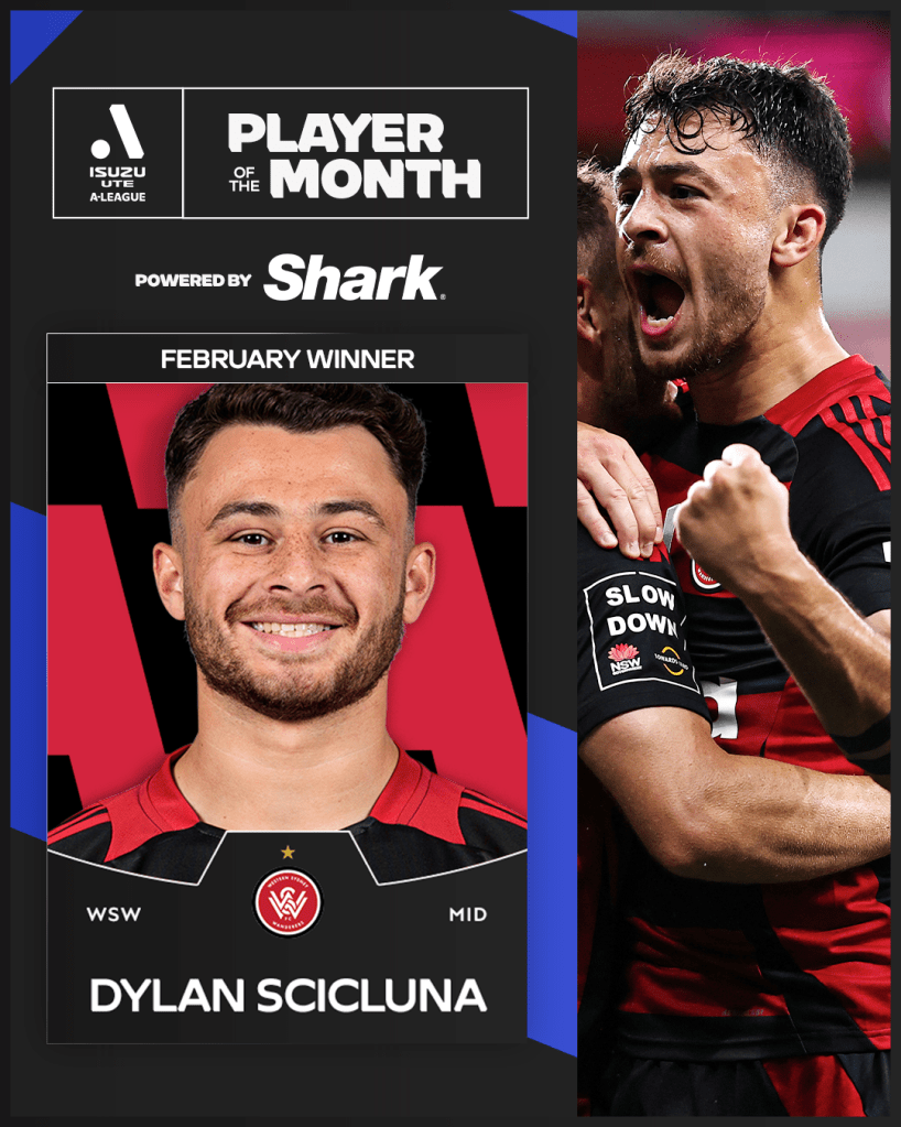 Western Sydney Wanderers midfielder Dylan Scicluna has been named Shark Player of the Month for February after a fan vote.