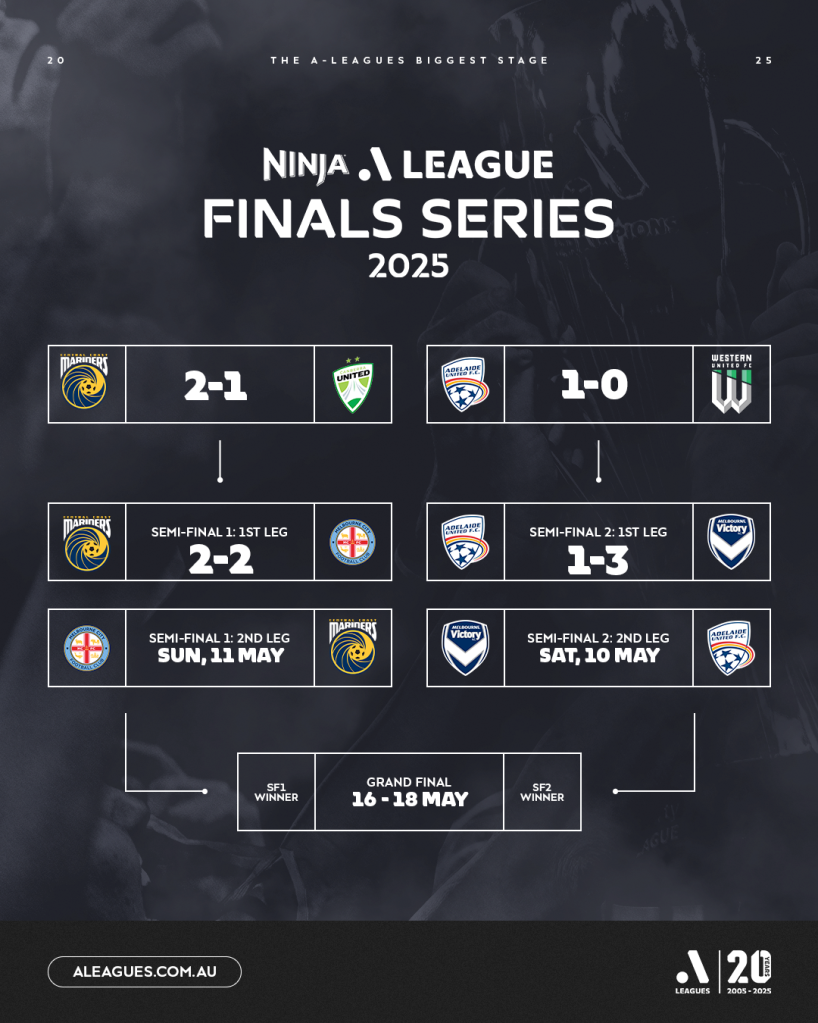 During the Ninja A-League 2025 Finals Series matches will be shown live across a mix of Network 10, 10 Play and Paramount+. Please see the broadcast details below for next weekend’s Semi-Finals leg two.