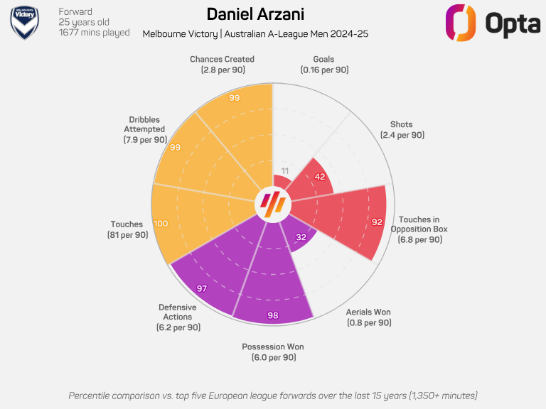 His numbers are elite. He ended the season as the top-ranked player in the A-Leagues for dribbles completed, opposition box take-ons and opposition half take-ons. More impressively is the fact he was first for tackles and tackles won among forwards in 2024-25.