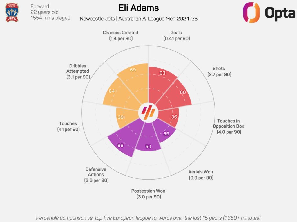 Eli Adams is coming into his own at Newcastle Jets as he benefits from regular first-team football. aleagues.com.au looks at the numbers behind the talented attacker.