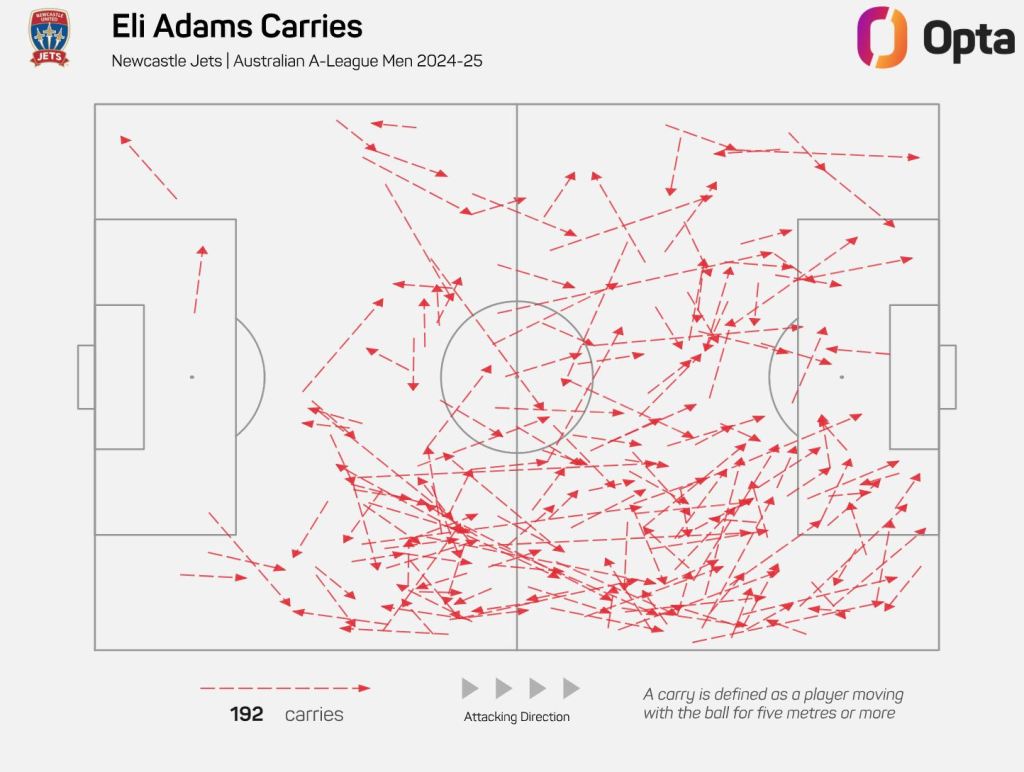 He ranks fourth for goals scored behind Western United sensation Noah Botic, Adelaide United young gun Archie Goodwin and Western Sydney Wanderers’ Nicolas Milanovic using the same criteria, Adams also sits in the top four for total carry distance (2,126), total carry progress (1,129.5), total carries (192), carry directness (78.5), chances created from open play (22) and big chances created (six).