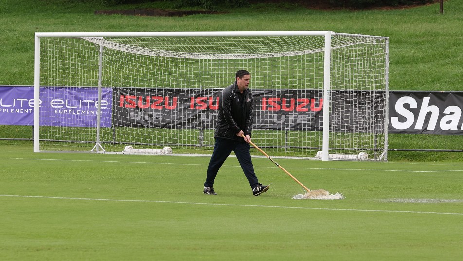 Kick-off to the fixture originally scheduled for 6.00pm AEDT was postponed twice due to heavy rainfall in Brisbane, resulting in water pooling on the Perry Park pitch.