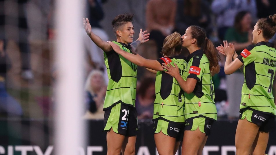 Michelle Heyman gets mobbed after netting on her Westfield W-League return against Adelaide United.