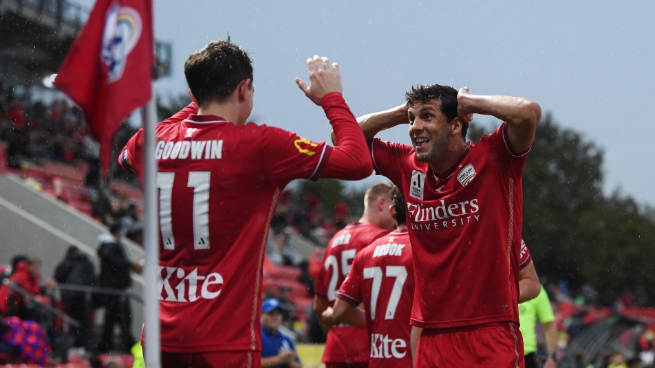 Goodwin had the chance to restore Adelaide’s lead with a free-kick from similar range to his first on the cusp of half-time, but could only sting the gloves of Daniel Margush as the a first 45 filled with committed challenges, classy goals and big talking points came to an end.