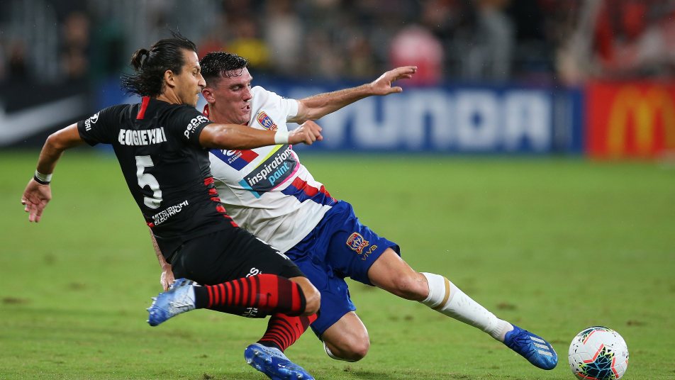 Daniel Lopar had not been tested in the Wanderers goal but Newcastle sprang to life at the end of the opening half. First, Dimitri Petratos headed straight at the Swissman on 40 minutes, before Matthew Millar forced a sharp stop at the near post after being picked out by Nigel Boogaard: the best chance of any note Robinson’s side constructed in the opening stanza.
