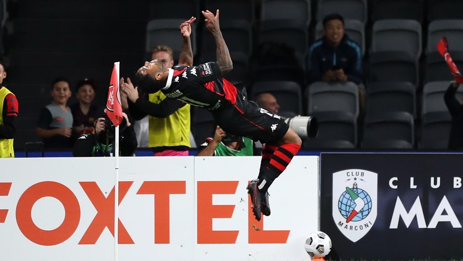 It left a crazed Bankwest Stadium to celebrate a remarkable 4-3 victory which sends the Wanderers six points behind leaders Central Coast Mariners, who drew 2-2 with Perth Glory on Sunday.