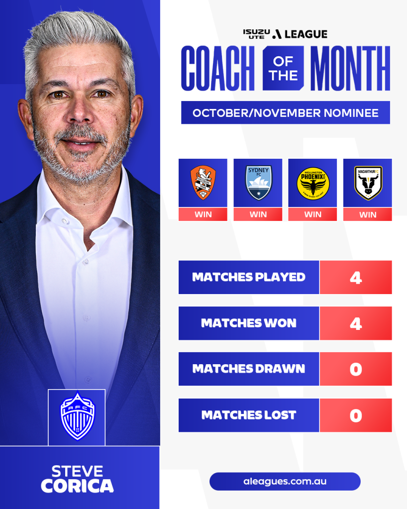 Corica and Auckland have since extended that run to five wins and five clean sheets but the eligibility for the October/November Coach of the Month nomination only extended to the end of Round 5, with games between October 18 and November 24 considered by the voting panel.