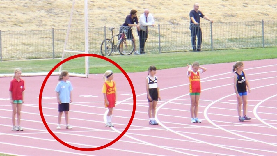 They’re stood side by side on the track, preparing to sprint off into the distance. Maher in her school’s sport shirt and shorts, Flannery with knee-high white socks, a black headband, and an oversized red singlet.