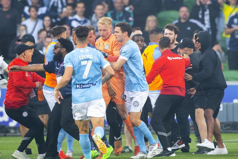 Melbourne City goalkeeper Tom Glover was hit by a metal bucket wielded by a pitch invader and referee Alex King was also injured, while a television cameraman was struck by a flare.