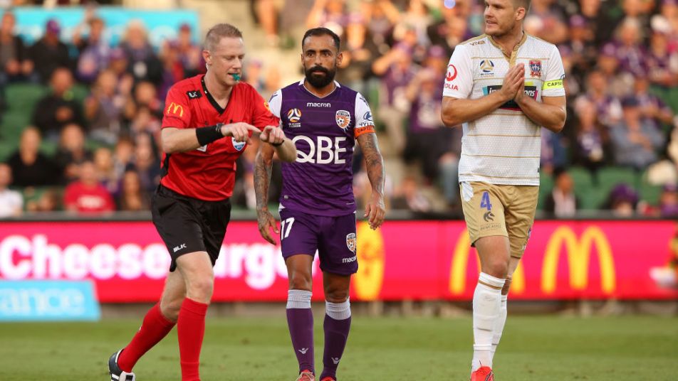 The referee allowed play to continue after contact between Perth Glory’s Joel Chianese and Newcastle Jets’ Nigel Boogaard in the penalty area. The referee then awarded a defensive free kick to Newcastle Jets.