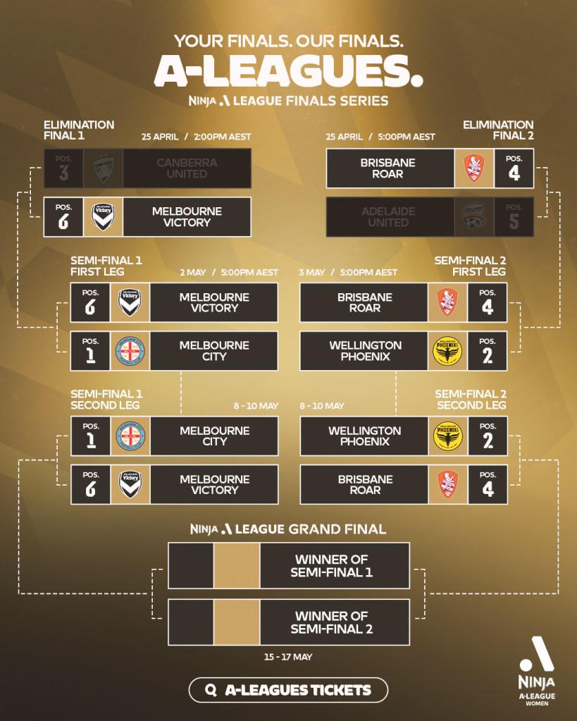 The Ninja A-League Women’s Finals Series kicks off April 25, 2026, launching a three-week sprint to glory. With Melbourne City, Wellington Phoenix, Canberra United, Brisbane Roar, Adelaide United and Melbourne Victory all in the hunt.