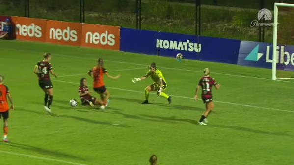 Larissa Crummer scores her fourth goal of the campaign for Brisbane Roar.