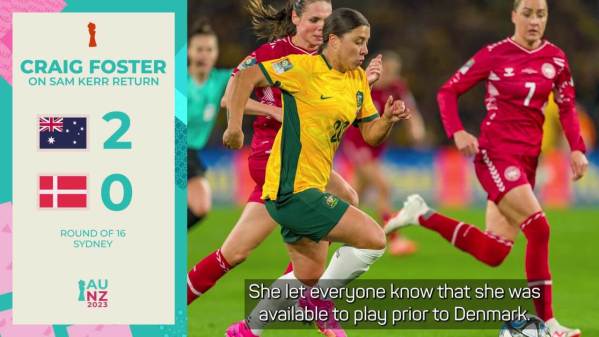 3 years ago • A-League WomenCraig Foster delighted with Sam Kerr returnFormer Socceroos captain Craig Foster is delighted with Sam Kerr's return to action for the Matildas, saying it was "wonderful" for people to see her play in Australia's 2-0 win over Denmark.