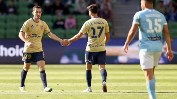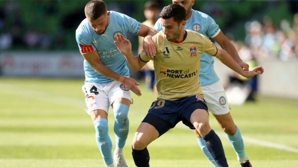 Aiden O'Neill comes close to finding the opener against the Newcastle Jets.